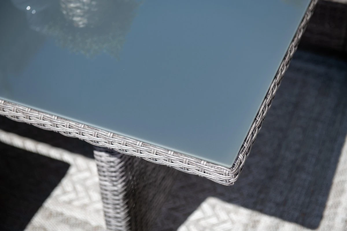 Het hele set heeft een sterk aluminium frame dat bespant is met van hand gevlochten wicker in de kleur organic grey. Het optisch dubbele vlechtwerkdraad uit kunststof zorgt niet alleen voor een luxe uitstraling maar is ook nog vrij makkelijk te onderhouden en weerbestendig. Voor een hoge zitcomfort zorgen de lekker dikke kussens van spunpolyester in de kleur donker antraciet. Verder zijn de kussens vuil- en rotwerend en zorgen voor een echte lounge ervaring. De tafel beschikt over een tafelblad gemaakt van veiligheidsglas.